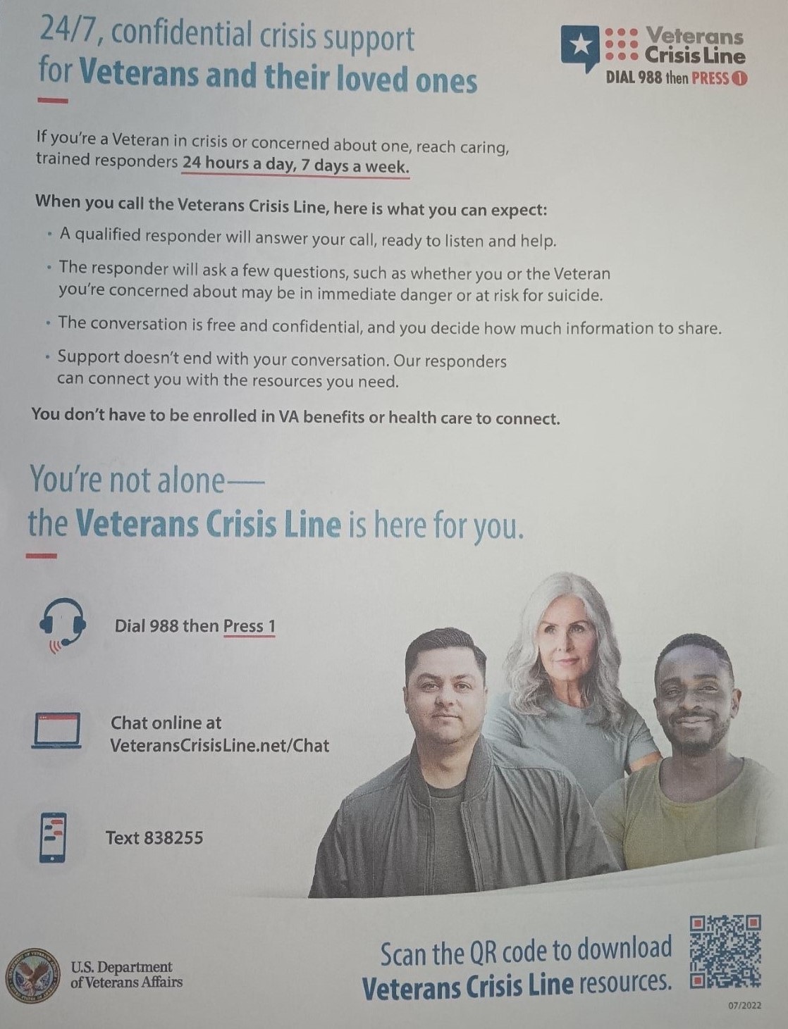 If you're a veteran in crisis or concerned about one, reach caring trained responders 24 Hours a day. You're not alone. The link below will direct you to the help you're looking for or download the Veterans Crisis Line document below. Either one will direct you to responders who want to help.